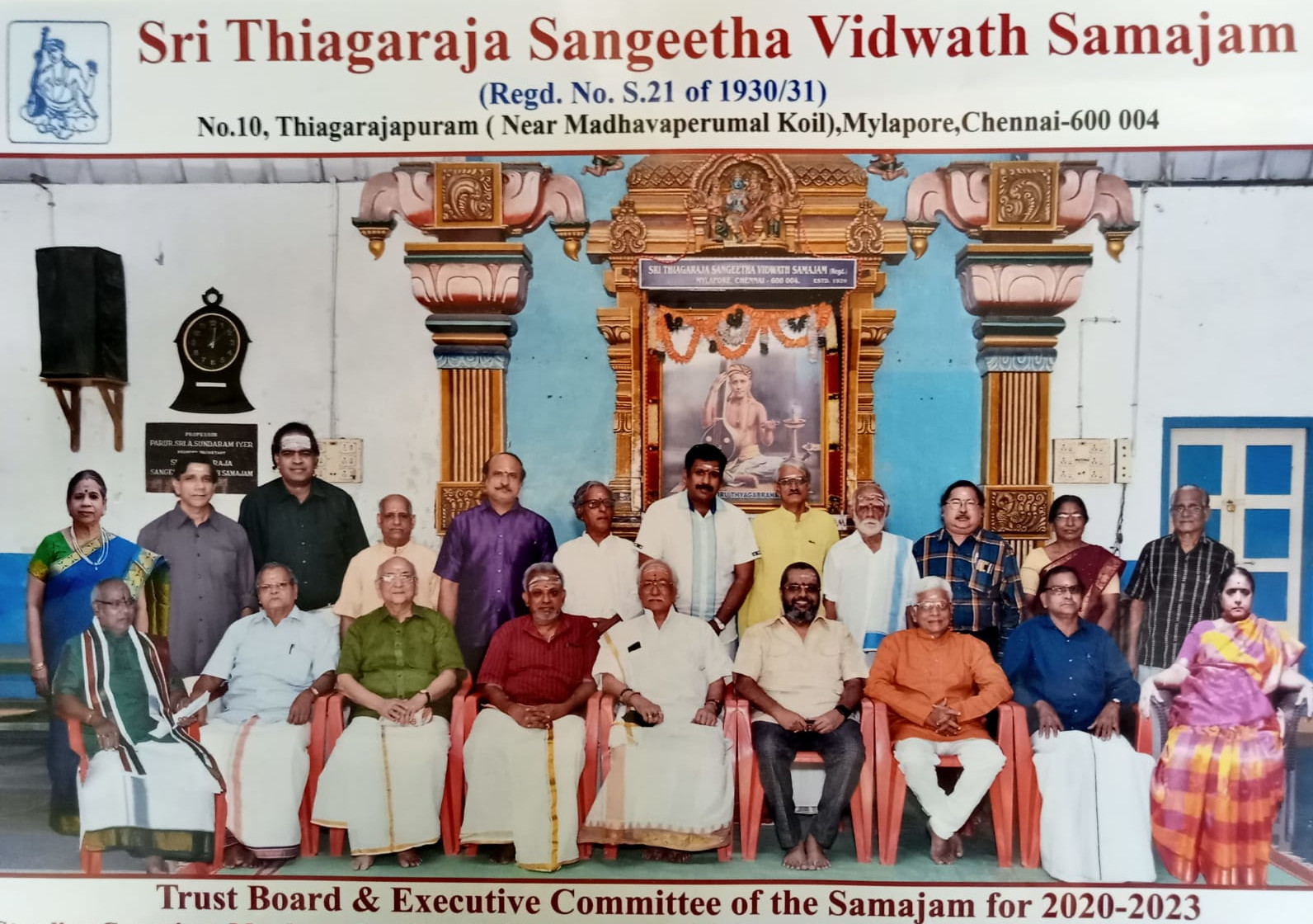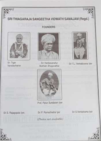 The Trust Board was formed in 1965 and the following were the FIRST TRUSTEES : Sangitha Kalanidhi Sri T.L. Venkatarama Iyer, Sangitha Kalanidhi Sri Musiri Subramaniyam Iyer, Sangitha, Kalanidhi Sri Maharajapuram Viswanatha Iyer, Sri K. Chandrasekaran, Sri. M.V. Venkataraman